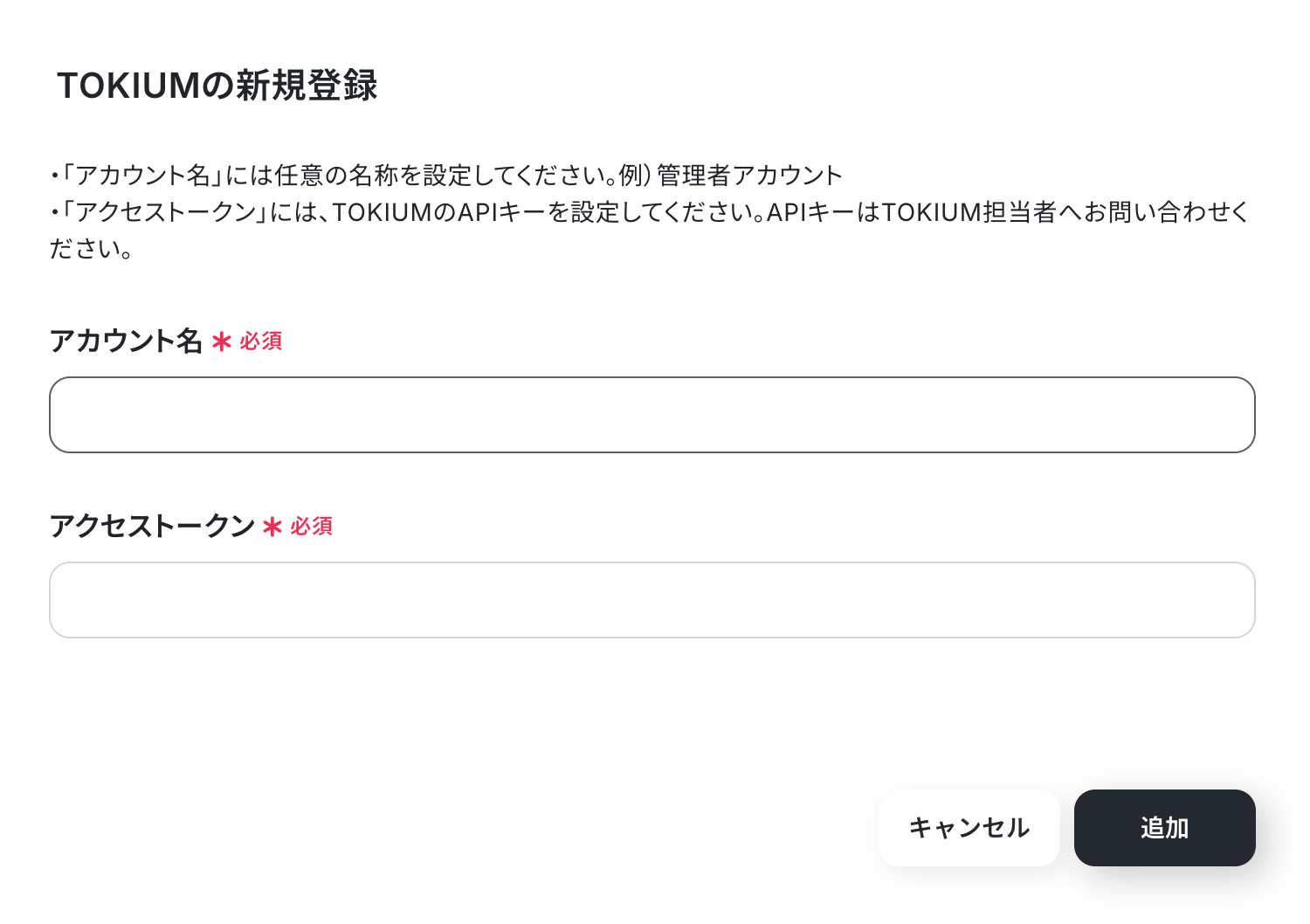 以下の画面が表示されるので、アカウント名とアクセストークンを注釈に沿って入力し、「追加」をクリックしましょう。