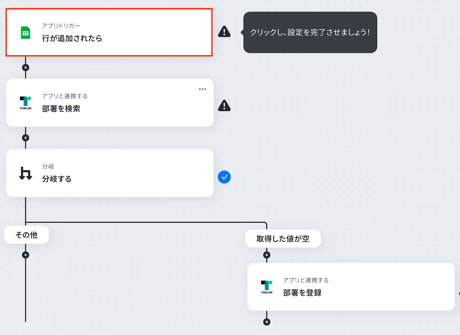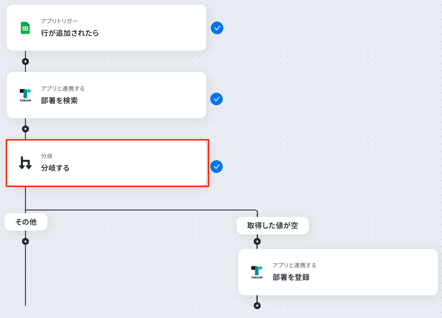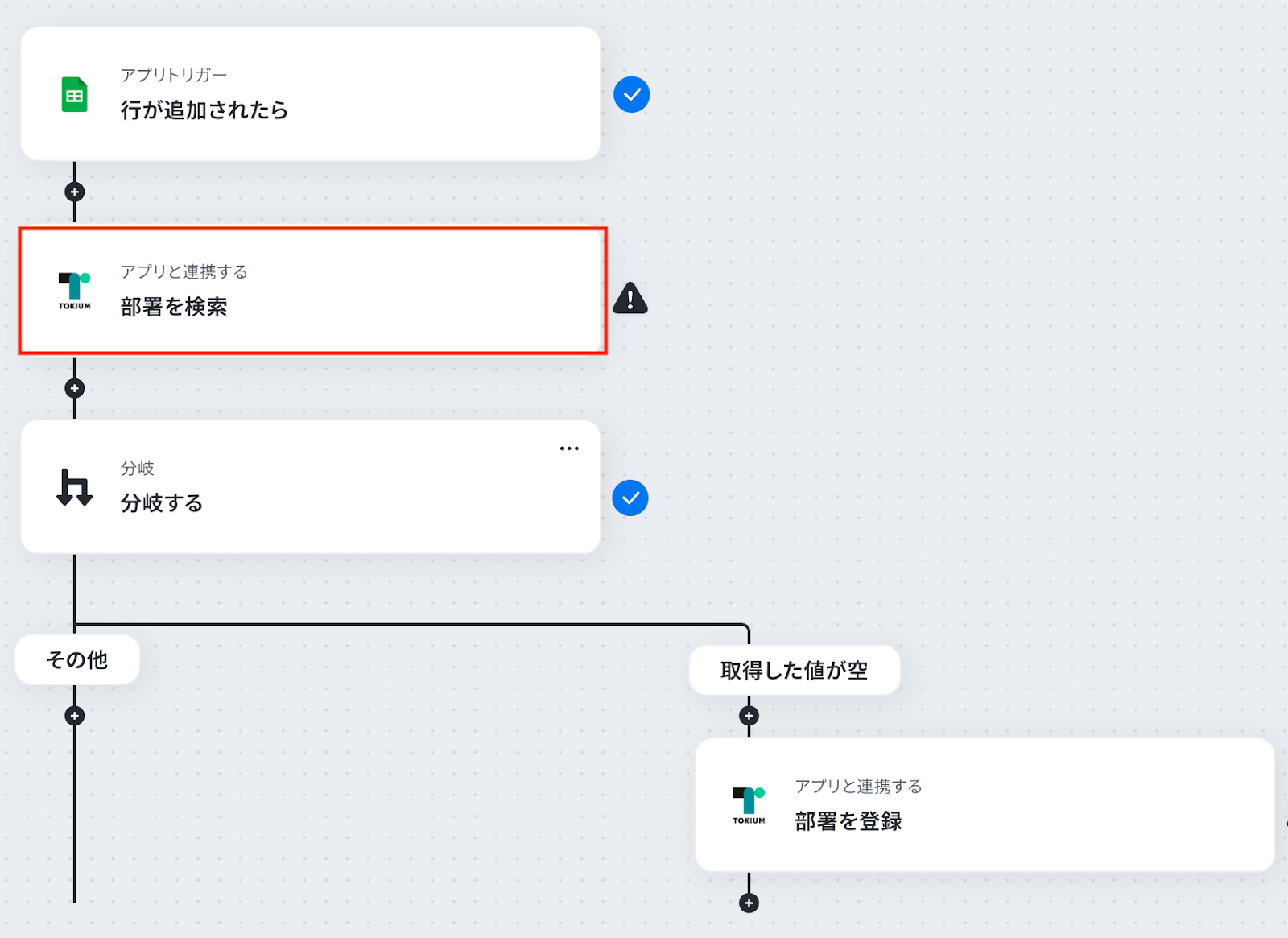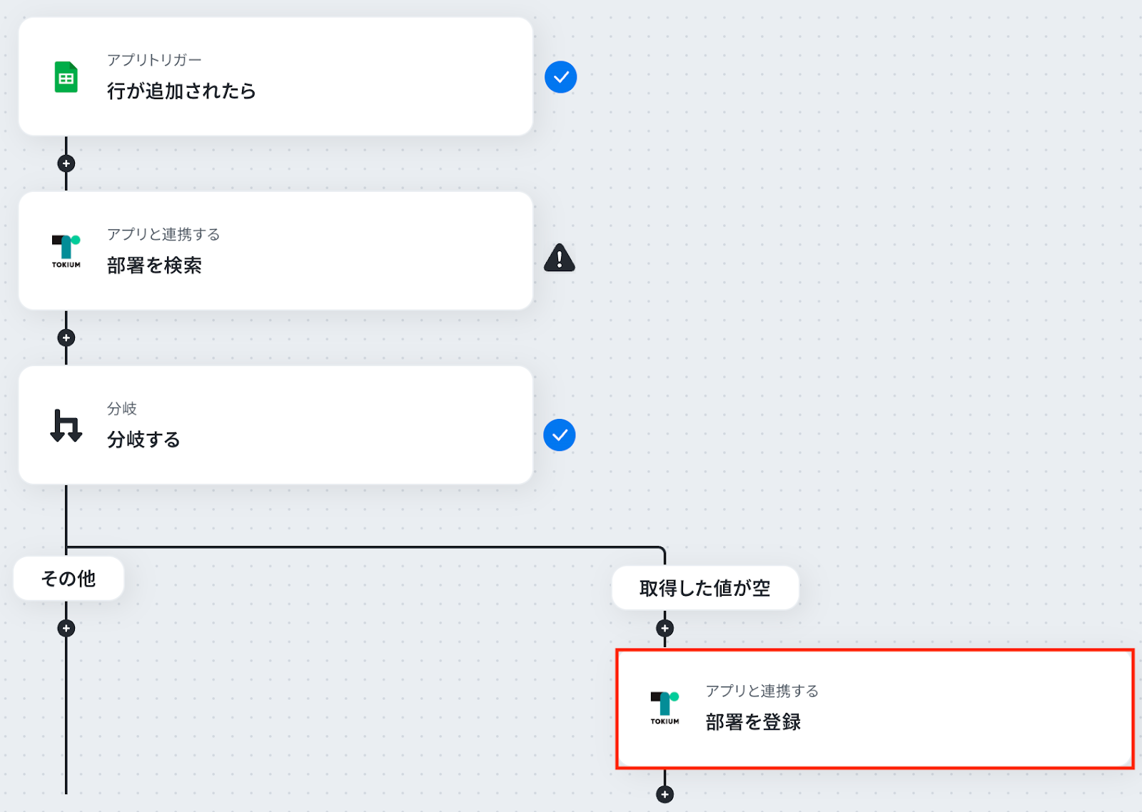 この設定により、TOKIUMで部署を検索した結果、部署IDが取得できなかった場合のみ、後続の部署登録の処理が実行されるようになります。