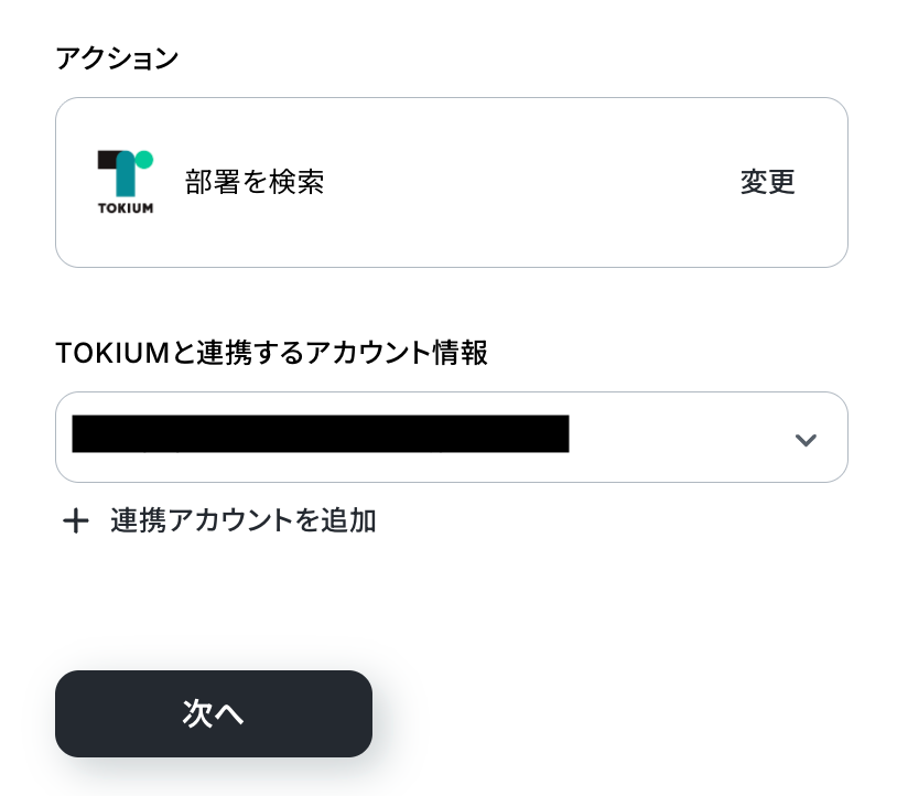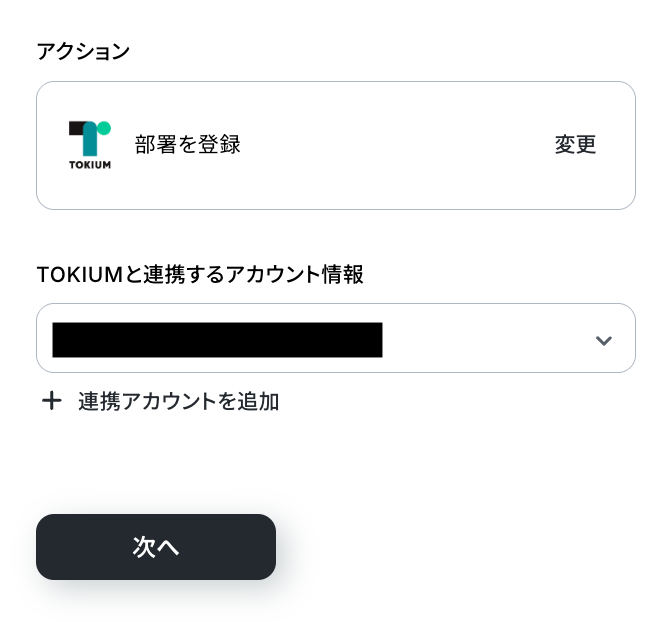 TOKIUMと連携するアカウント情報に問題がなければ、「次へ」をクリックします。