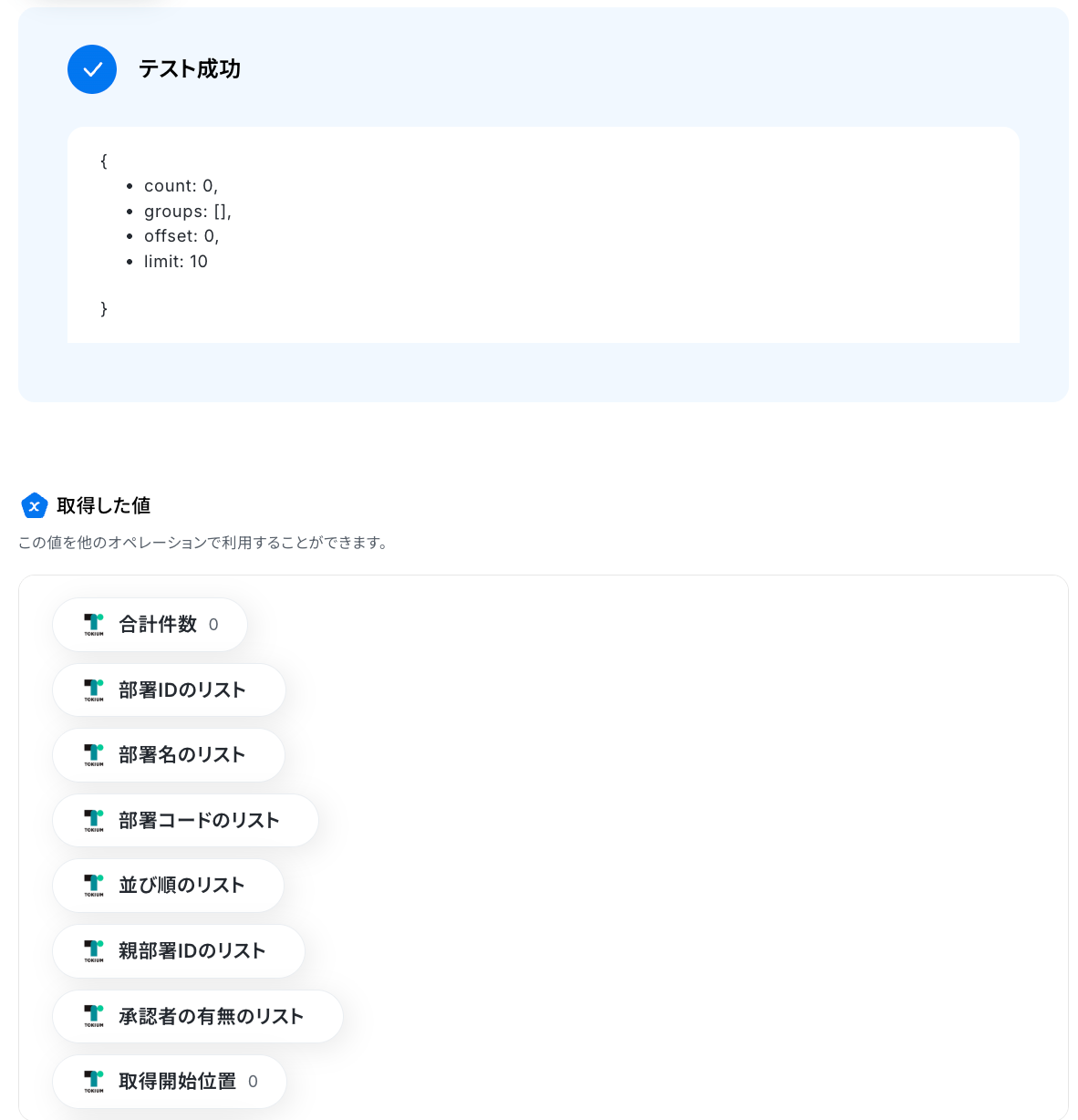 テストに成功すると、TOKIUMで検索された部署に関する情報が表示されます。
