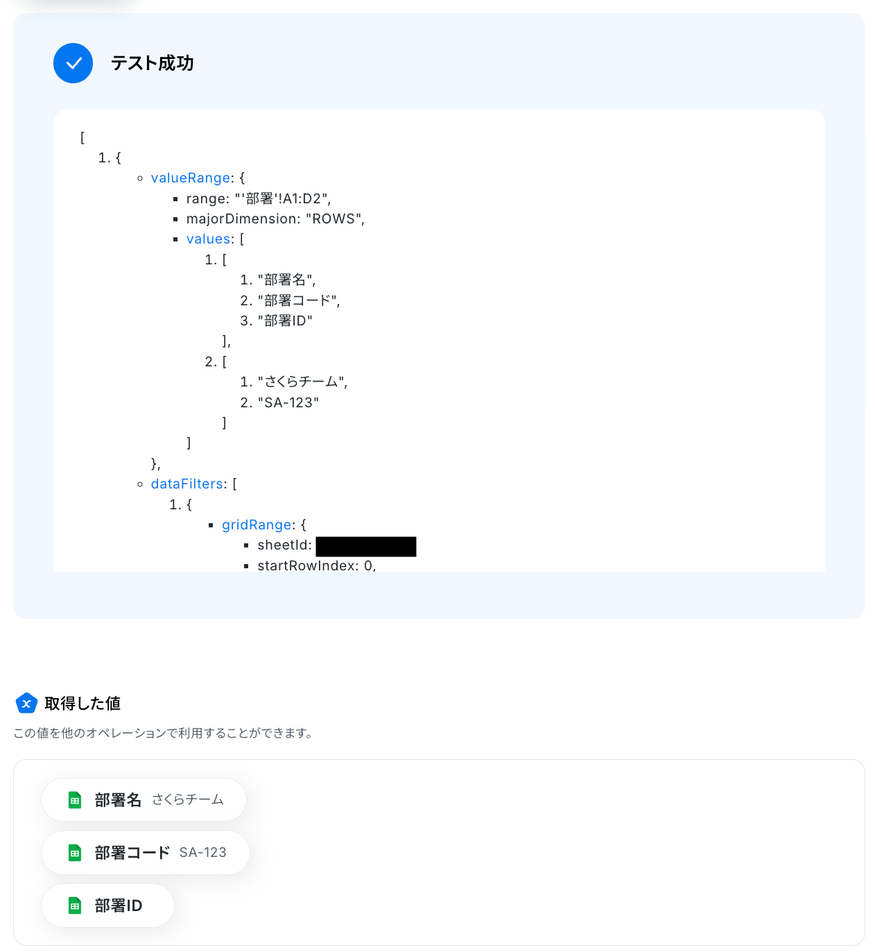 テストに成功すると、Google スプレッドシートに追加された行の情報が表示されます。