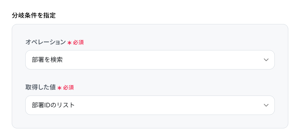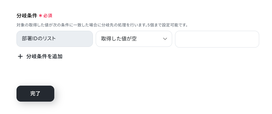 分岐条件では、「部署IDのリスト」「取得した値が空」を条件として設定します。