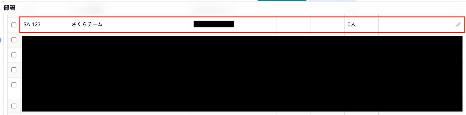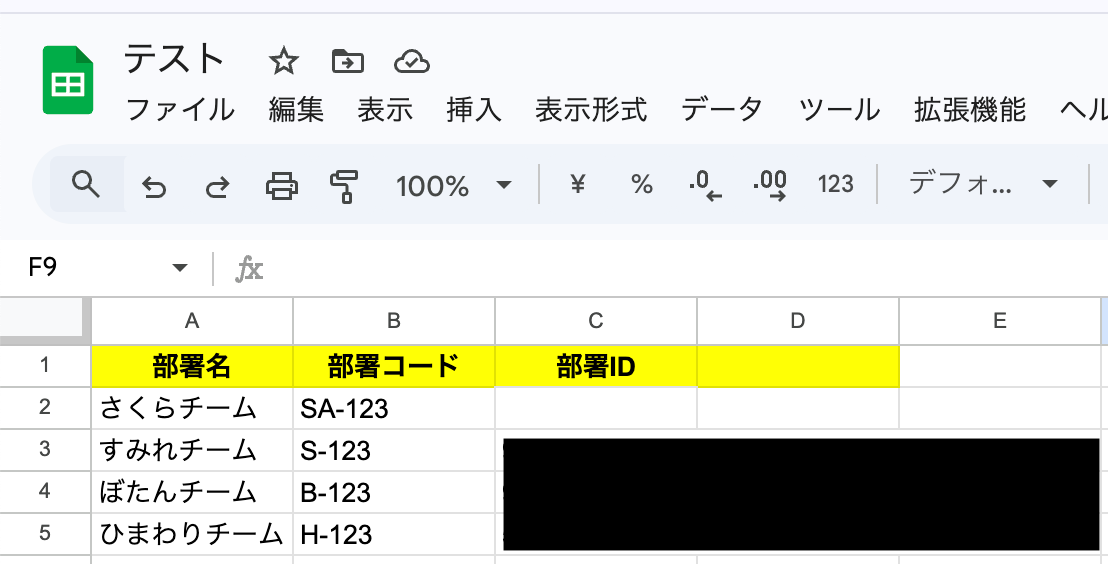 今回はテスト用に、Google スプレッドシートで管理している部署情報へ、以下の行を追加しました。