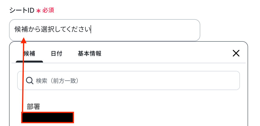 入力欄をクリックすると、同じく連携が有効になっているスプレッドシートから候補が表示されるので、対象の項目を選択してください。
