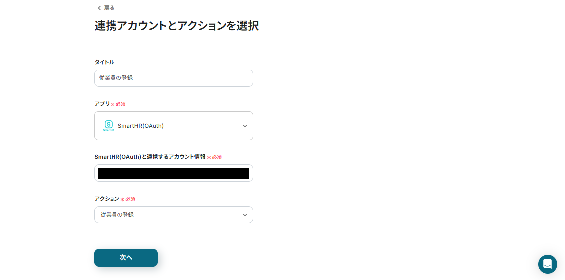 デフォルトで設定がされていますが、「SmartHRと連携するアカウント情報」が使用するアカウントで間違いが無いかを確認し、「次へ」をクリックしましょう。