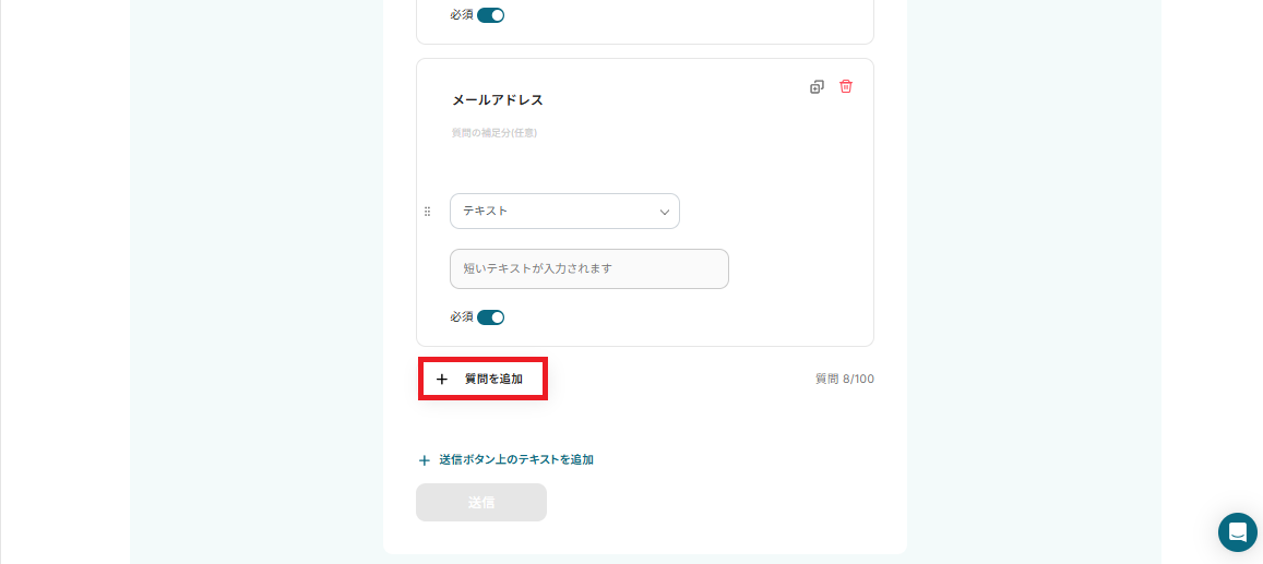 上記項目以外にも、住所等追加したい項目があれば、項目の一番下にある「質問を追加」ボタンを押すと追加することが可能です。