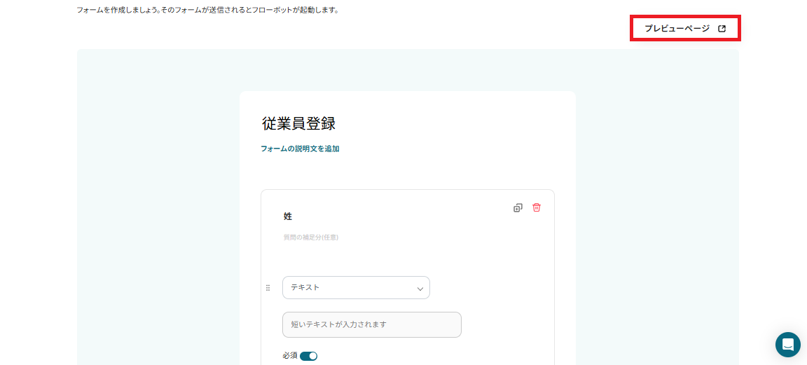 設定が完了したら、画面右上にある「プレビューページ」をクリックし、実際に使用するフォームページの表示を確認してみましょう。