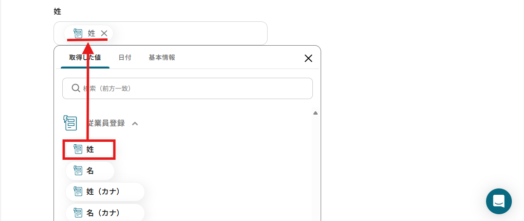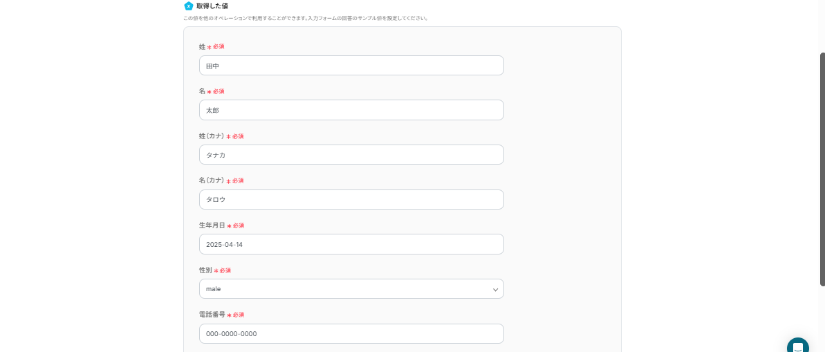テンプレートを使用しているため、「姓」には下図の通り、「取得した値」から引用できるように設定されています。