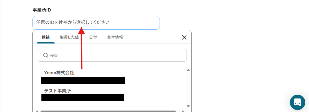 事業者IDは、枠内をクリックして表示される候補から選択してください。