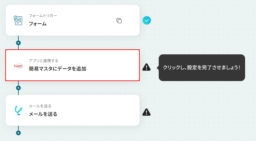 - 続いて、オペレーションでX-point Cloudの「簡易マスタにデータを追加」アクションを設定し、フォームで受け付けた情報を紐付けます。