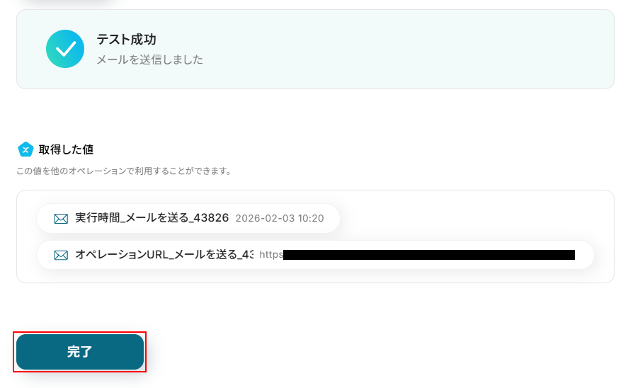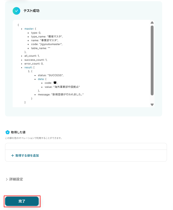 テストに成功するとテスト成功画面と取得した値が表示されますのでご確認ください。