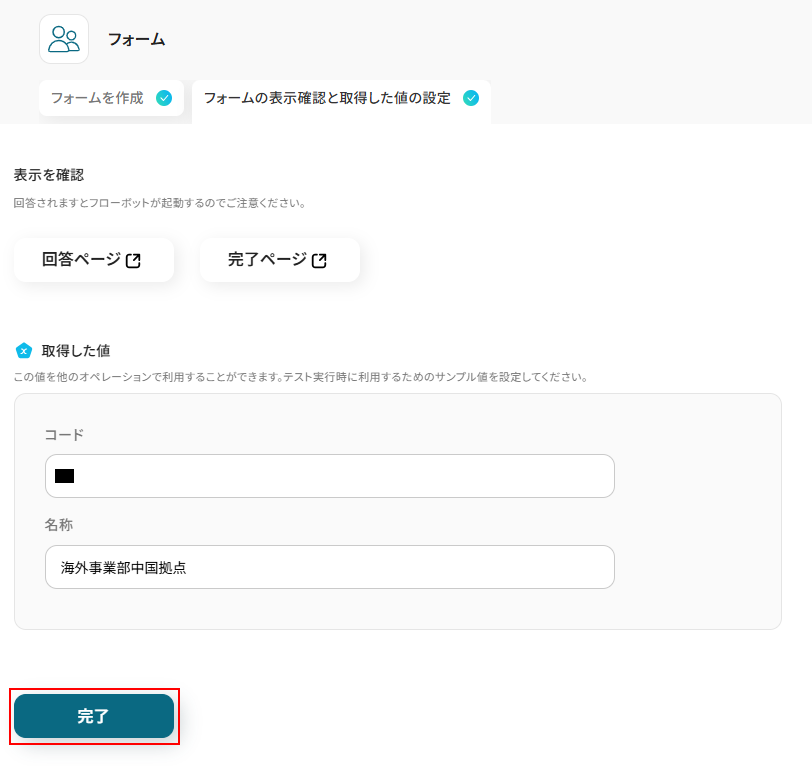 ※フローボットの設定が完了後、トリガーをONにすると、回答ページが有効になりますのでご確認ください。
