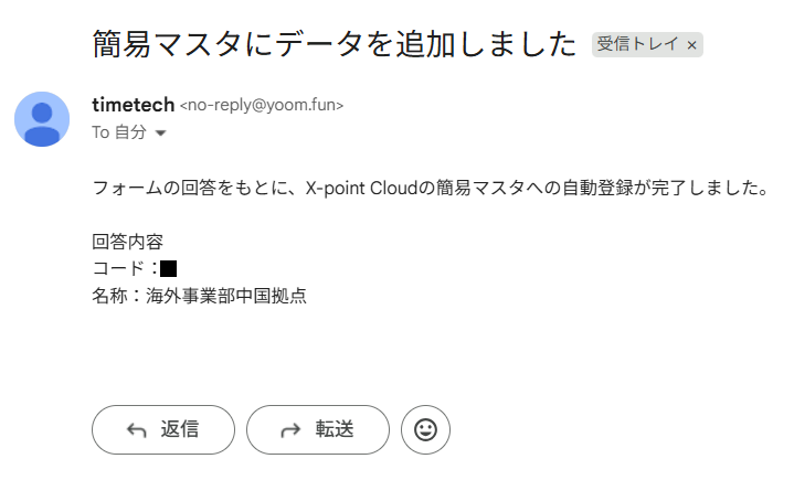 - フォームが送信されると、自動でX-point Cloudの簡易マスタへデータが登録されるため、手作業の時間を削減できます。