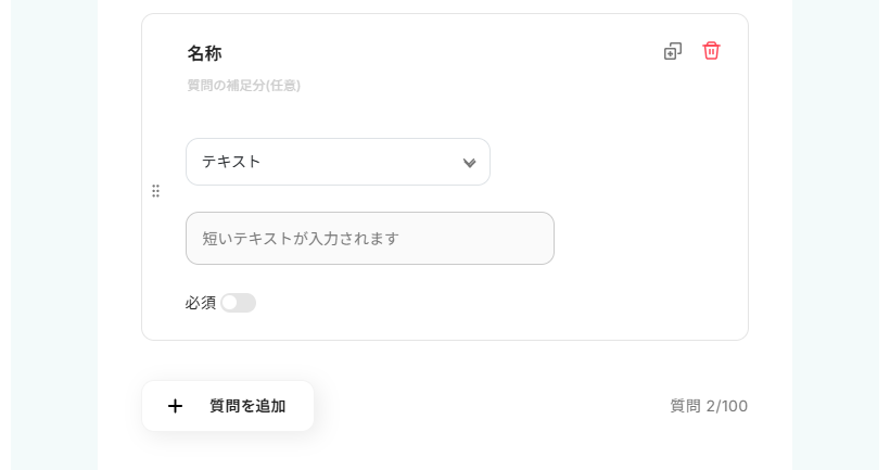 項目を追加したい場合は、+質問を追加をクリックし設定を行ってください。
