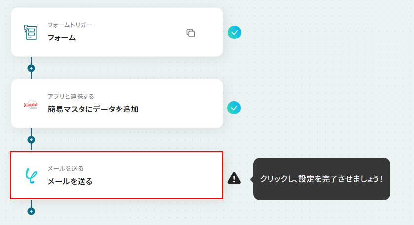 - 最後に、メール機能で「メールを送る」アクションを設定し、処理完了の旨を関係者に通知します