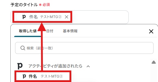 予定のタイトル、予定の開始日時、予定の終了日時を指定された形式で取得した値より入力していきます。
