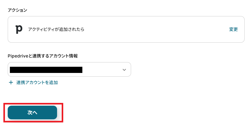 Webhookイベントの、「Pipedriveでアクティビティを追加」を行います。