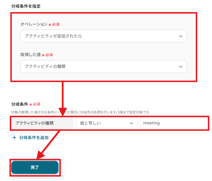 「オペレーション」「取得した値」はそのままで、「分岐条件」のアクティビティの種類と等しくなっている部分が、「meeting」になっているか確認してください。