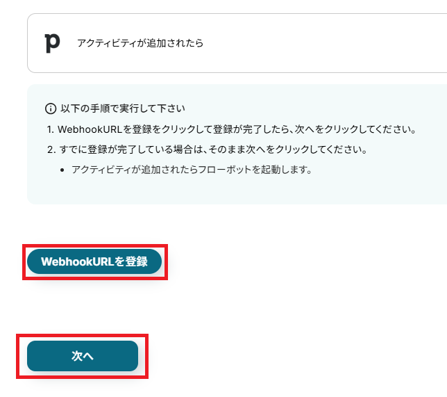 「WebhookURLを登録」を押し、WebhookURLの登録に成功したら「次へ」で進みます。