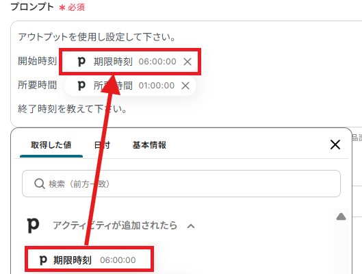 今回は終了時刻を抽出するため、以下のようなプロンプトとしています。