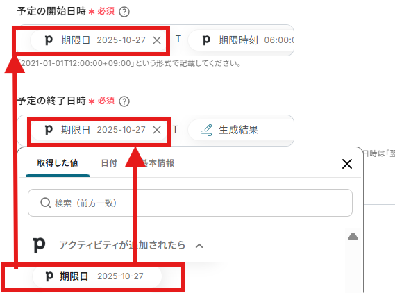 終了日時は、生成結果も組み合わせています。