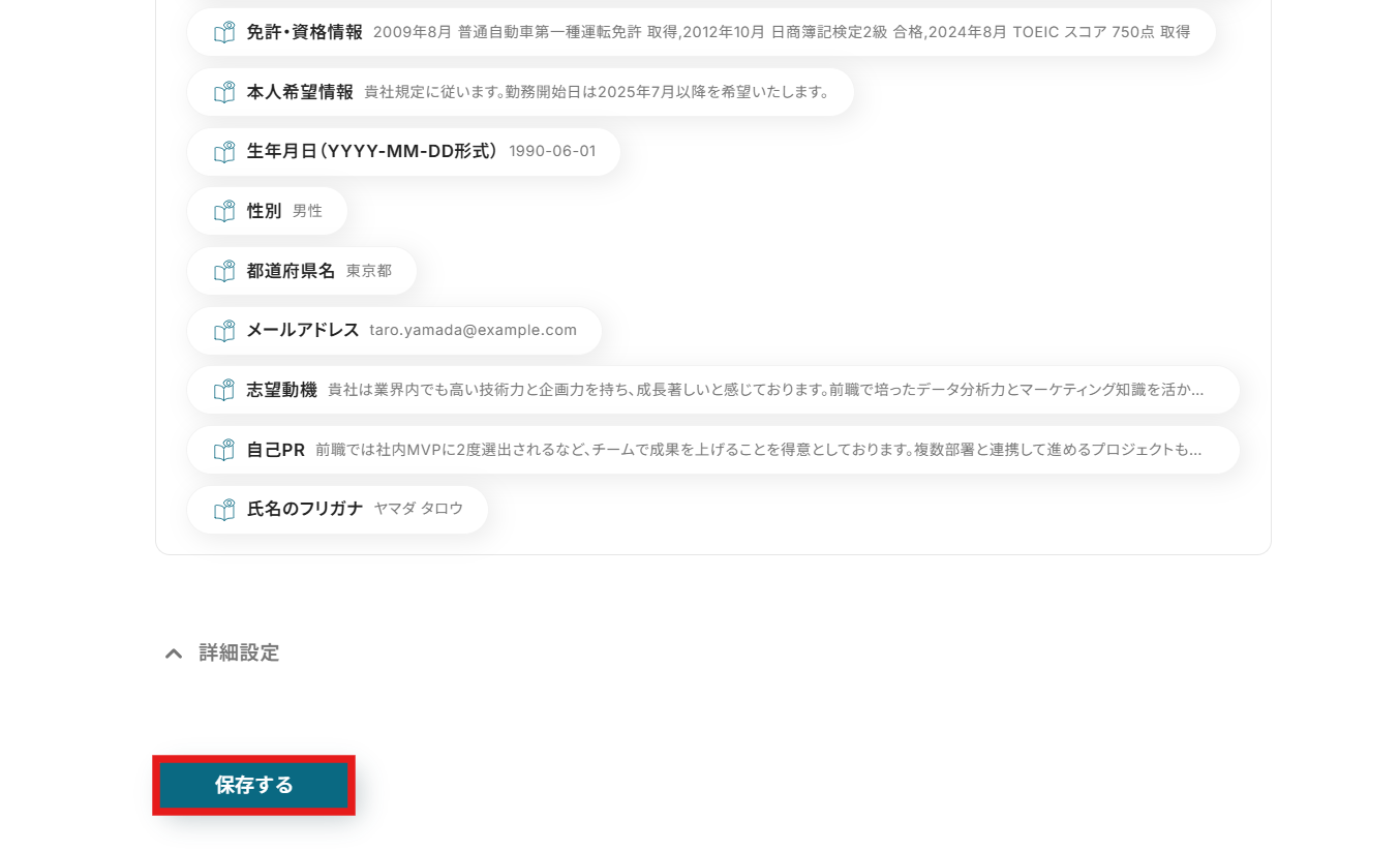 以上が、フォームで履歴書が送付されたら、OCRで読み取った人物情報をAIで要約してカオナビに登録する方法でした!
