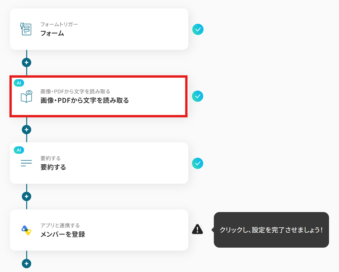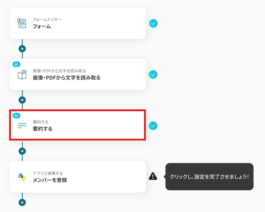 それではここから代表的な例として、フォームで履歴書が送付された際に、OCRで読み取った人物情報をAIで要約してカオナビに自動でメンバー登録するフローを解説していきます!