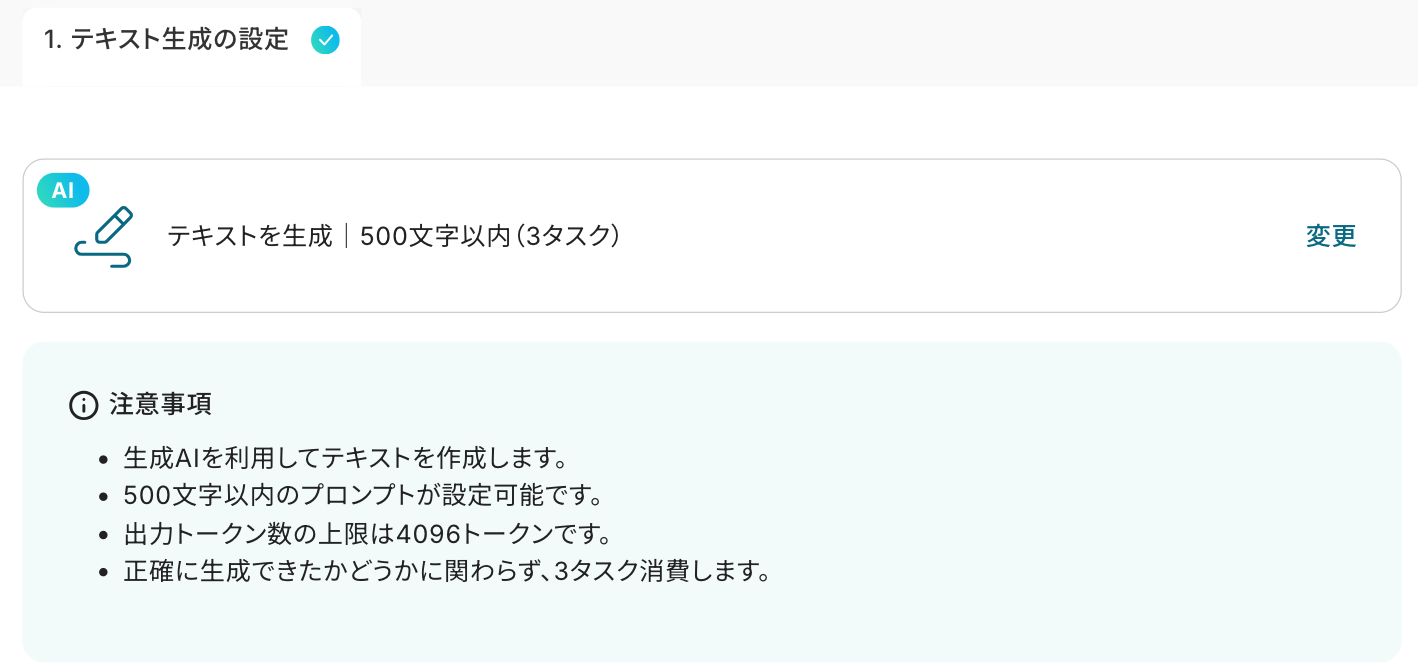 以下の画面が表示されるので、注意事項を確認しましょう。 「変更」をクリックすると、「指示可能なプロンプトの文字数」を変更できます。 文字数によって消費するタスク数が異なりますので、以下のリンクを確認してください。