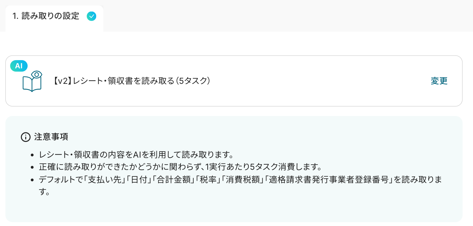 まずは、注意事項を確認しましょう。 赤枠部分をクリックし、読み取りたい文字数やタスク数に応じて、設定を変更してください。 今回は、領収書から内容を読み取りたいので、以下のように設定します。