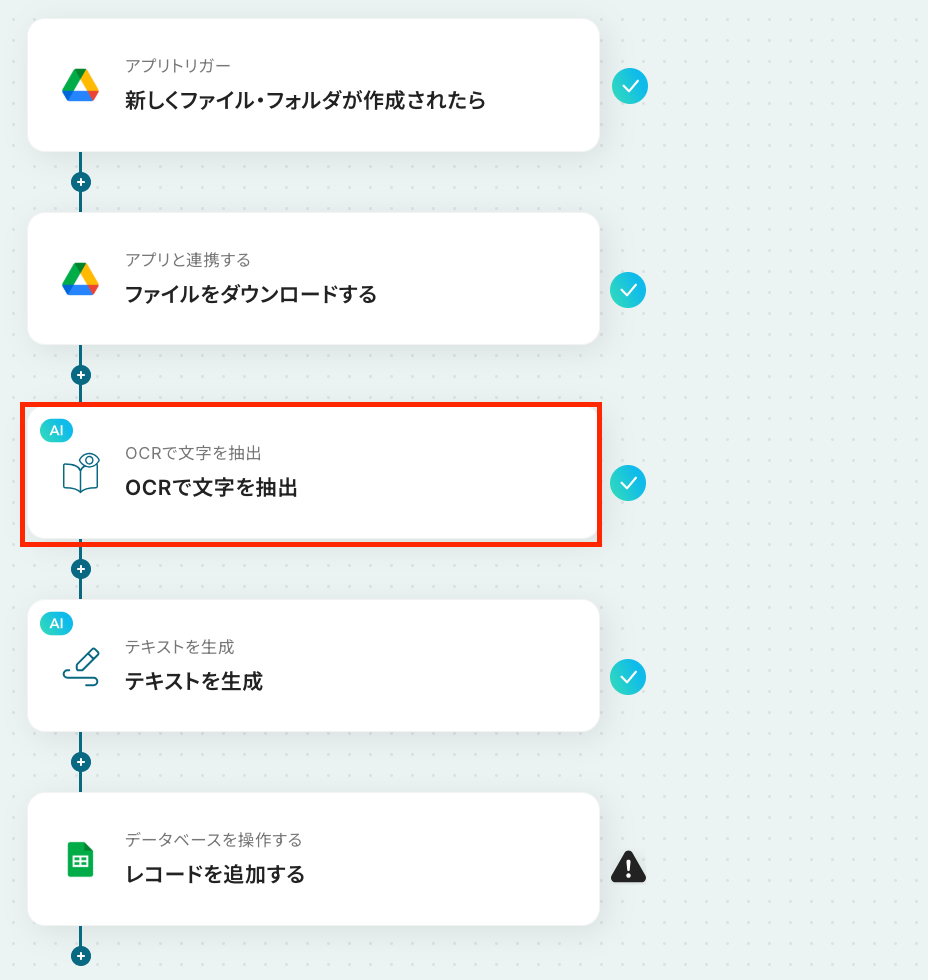 Google Drive上の領収書をGoogle スプレッドシートに自動登録するフローを作ってみよう それではここから代表的な例として、Google Driveに領収書ファイルが格納されたら、ファイル内の情報をOCR機能で自動で抽出し、Google スプレッドシートに登録する フローを解説していきます!