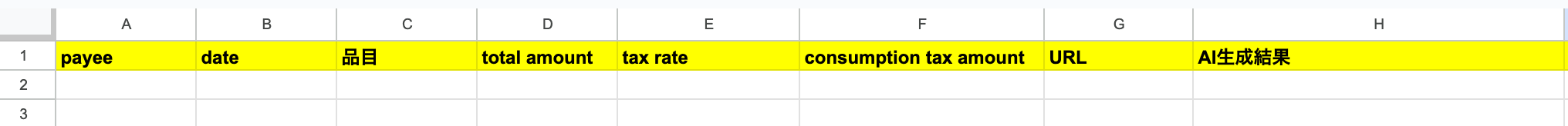 テーブル範囲 :今回は以下のシートを使用するため、テーブル範囲は「A1:H」です。 ※ヘッダーがテーブル範囲内に含まれるように設定しましょう。 ※「URL」列を設定することで、Google Driveにアップロードされた領収書をシート上で確認することができます。