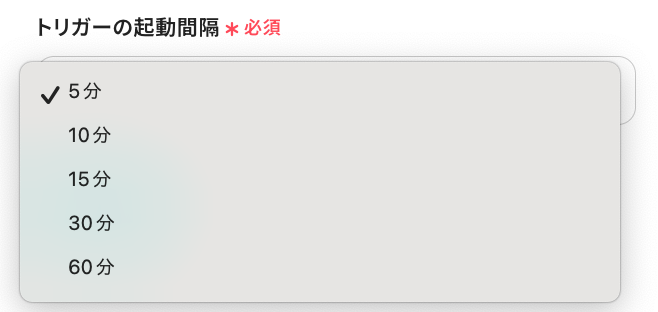 Yoomの画面に戻って、API接続設定を行います。「トリガーの起動時間」 は5分、10分、15分、30分、60分の間隔で起動間隔を選択できます。 ここでは、基本的にはご契約プランの最短起動間隔にしてお使いいただくことをおすすめします。 ※プラン によって起動間隔の選択内容が異なるため、ご注意下さい。