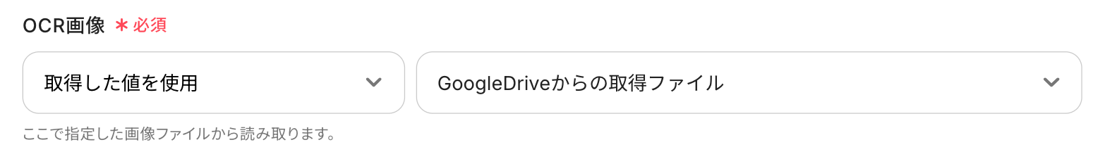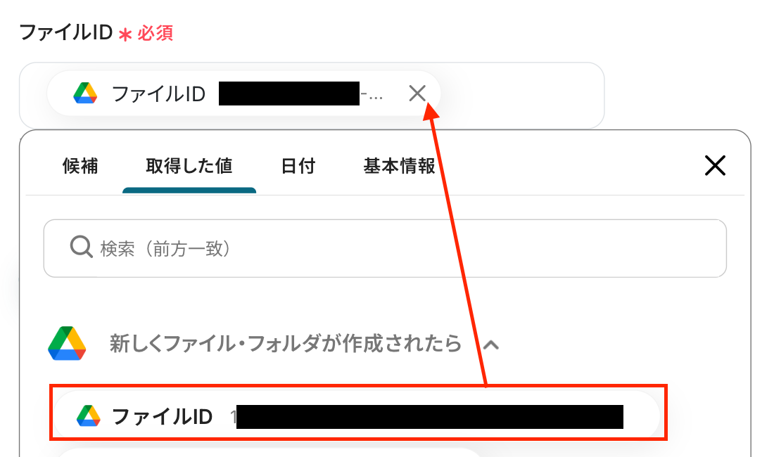 クリックすると、API接続設定画面に移ります。 まずは、「ファイルID」 を設定してください。 以下のように、Google Driveのトリガー設定で取得した値から選択しましょう。