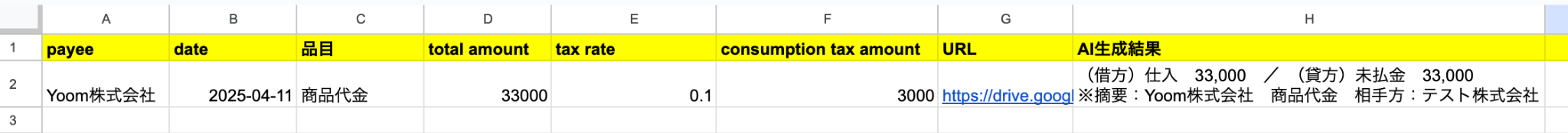 Google スプレッドシートの画面に移り、レコードが追加されているか確認をしてみましょう。 無事に追加されましたね。以上でフローボットの完成です!