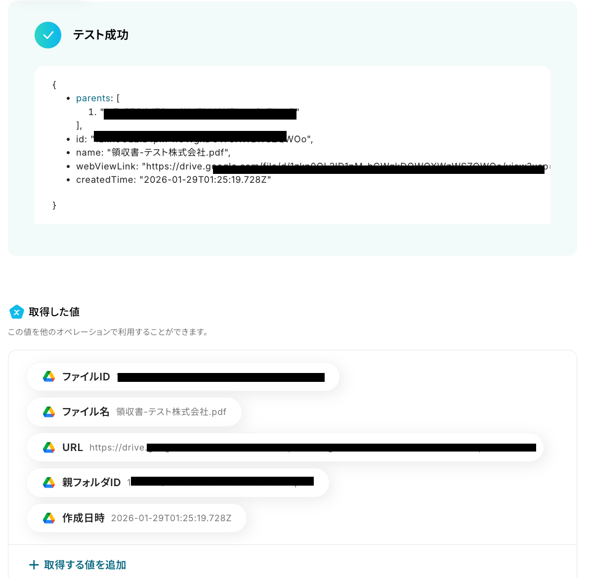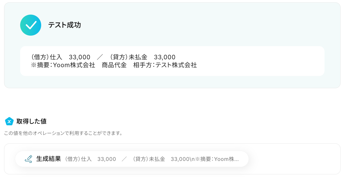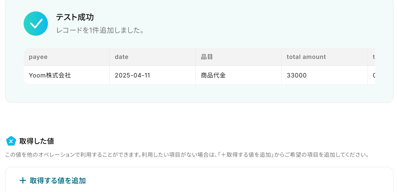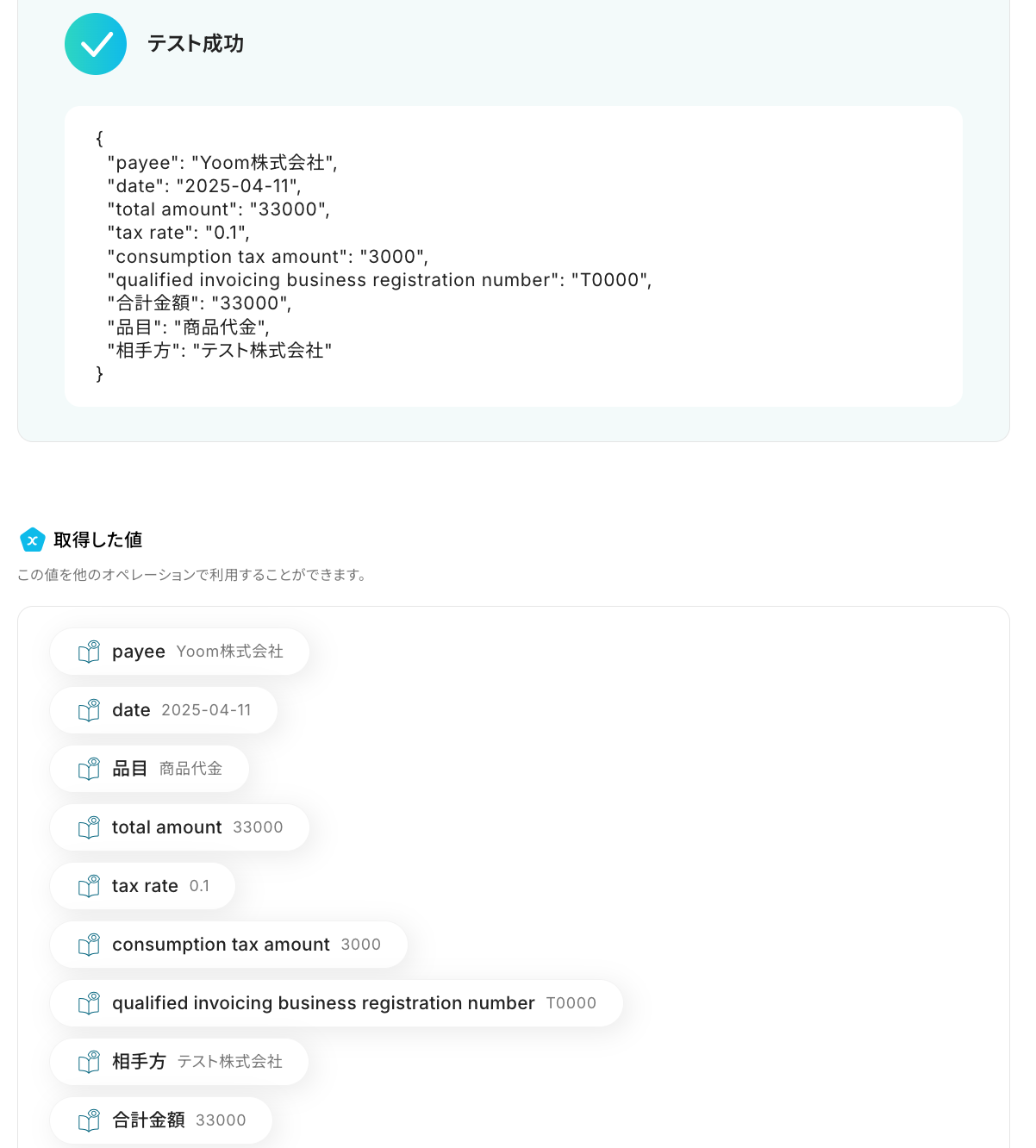 「テスト」をクリックしましょう! テストが成功すると、取得した値に反映されます。領収書の内容が抽出されましたね。 最後に「完了」を押して、次のステップへ進んでください。