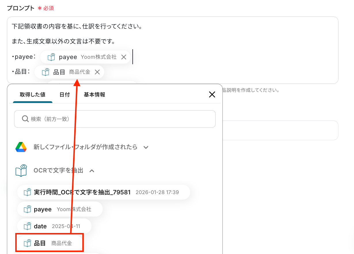 ここでは、AIでテキストを生成する際に使用するプロンプトを設定します。 今回はテンプレートを使用しているため既に設定されていますが、自由に設定することも可能です。 OCRの設定で取得した値を組み合わせて設定してください。 取得した値は、入力欄をクリックすると表示されます!