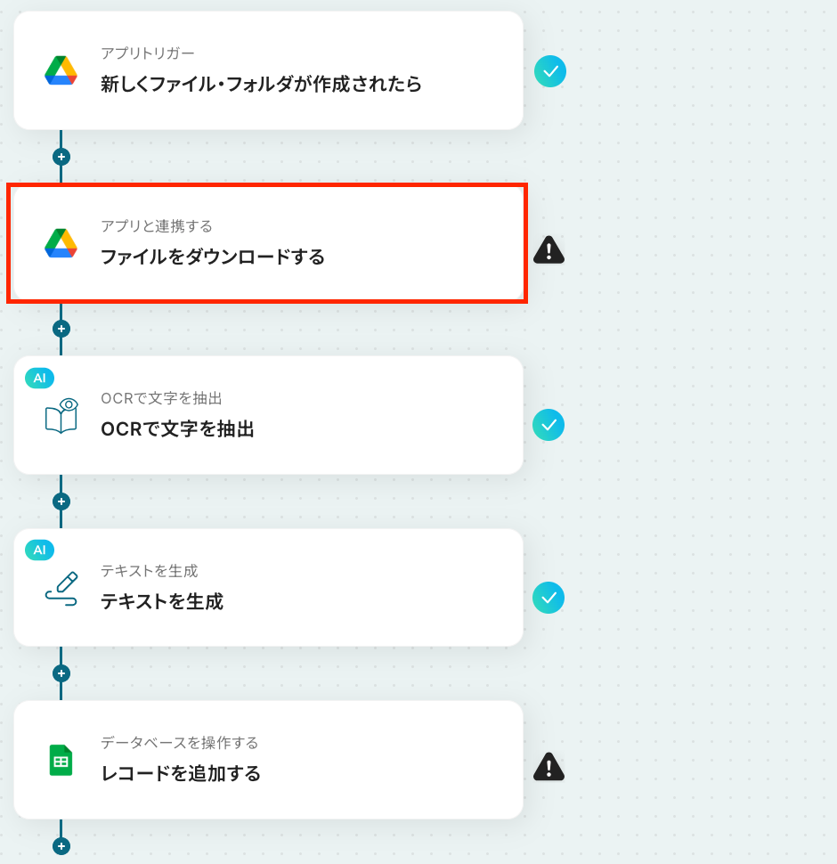 Google Drive、Google スプレッドシートのそれぞれとYoomを連携してください。 トリガーは5分、10分、15分、30分、60分の間隔で起動間隔を選択できます。 プランによって最短の起動間隔が異なりますので、ご注意ください。 OCRまたは音声を文字起こしするAIオペレーションはチームプラン・サクセスプランでのみご利用いただける機能となっております。フリープラン・ミニプランの場合は設定しているフローボットのオペレーションはエラーとなりますので、ご注意ください。 チームプランやサクセスプランなどの有料プランは、2週間の無料トライアルを行うことが可能です。無料トライアル中には制限対象のアプリやAI機能(オペレーション)を使用することができます。 ダウンロード可能なファイル容量は最大300MBまでです。アプリの仕様によっては300MB未満になる可能性があるので、ご注意ください。 トリガー、各オペレーションでの取り扱い可能なファイル容量の詳細は「ファイルの容量制限について 」をご参照ください。 OCRデータは6,500文字以上のデータや文字が小さい場合などは読み取れない場合があるので、ご注意ください。