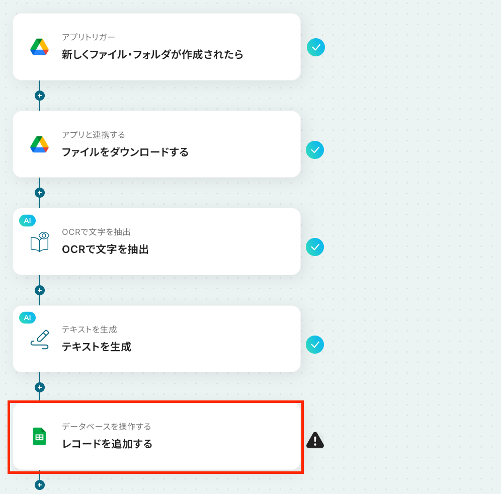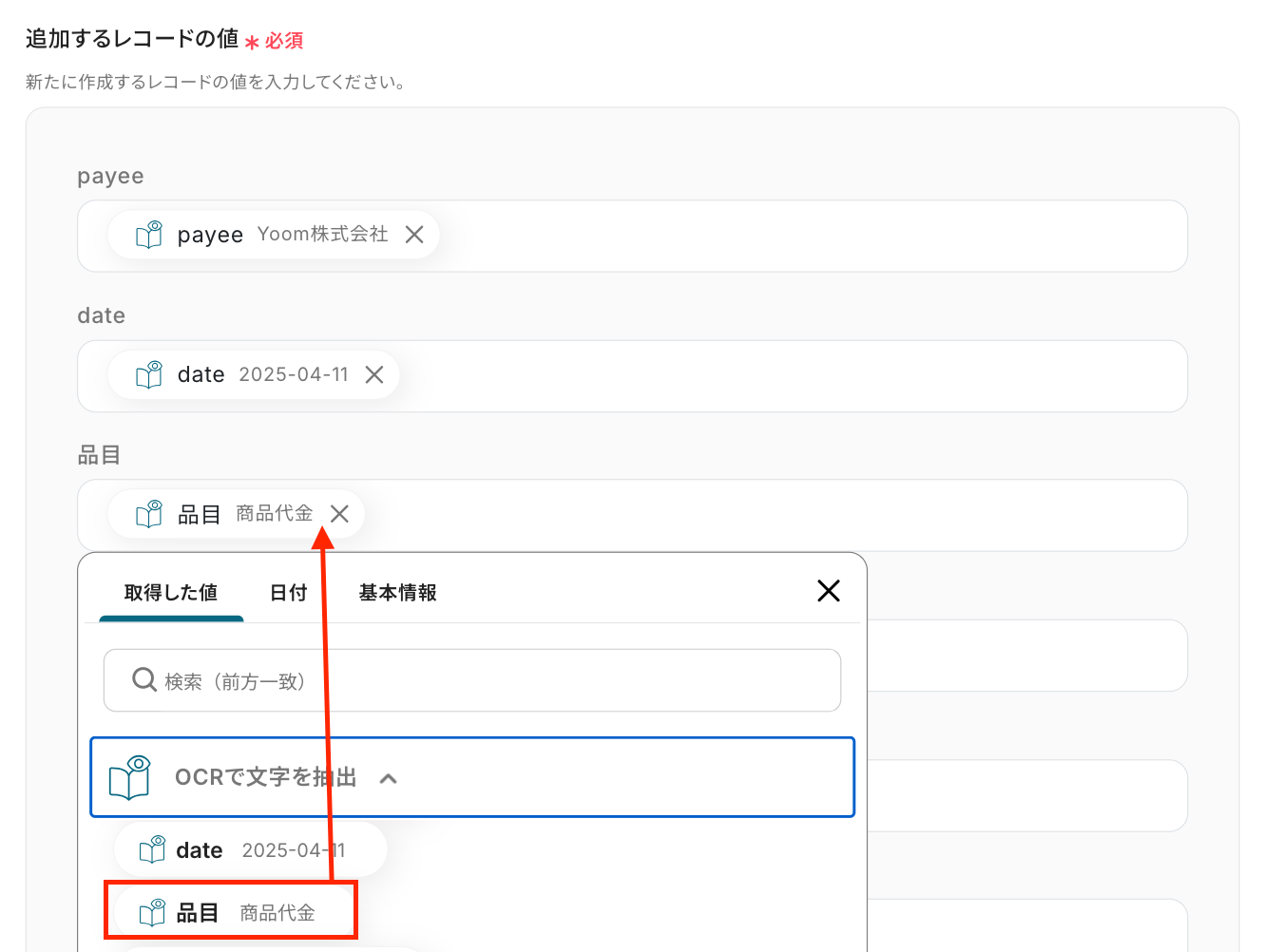 続いて、データベース操作の詳細設定画面に遷移します。 ここでは、「追加するレコードの値」 を設定しましょう。 各項目には、Google Driveのトリガー設定やOCR設定、テキスト生成の設定で取得した値を引用して設定してください。