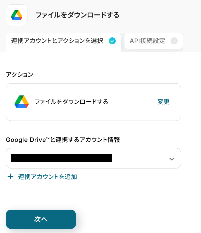 アクションはそのままで、連携するアカウント情報を確認します。 「次へ」をクリックして進みましょう!