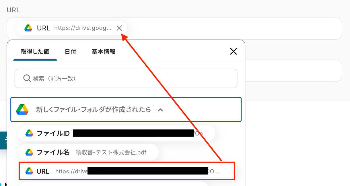 ※「URL」は、取得した値の「新しくファイル・フォルダが作成されたら」から選択できます。