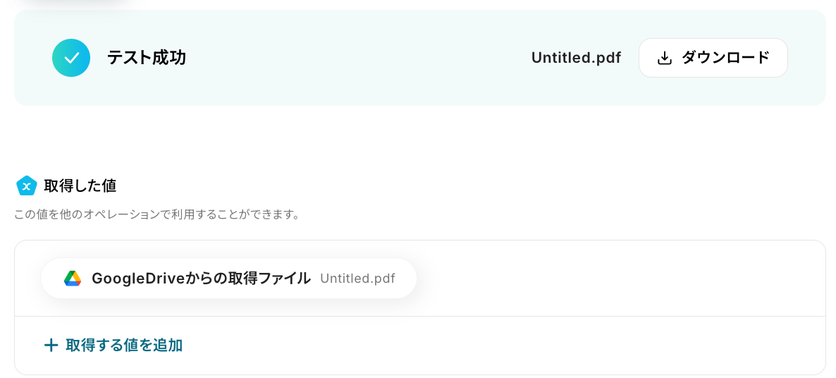 「テスト」をクリックします。 テストに成功すると、取得した値が表示されます。ダウンロードボタンをクリックすると、ダウンロードしたファイルを確認できます。 「完了」をクリックして、次のステップに進みましょう!