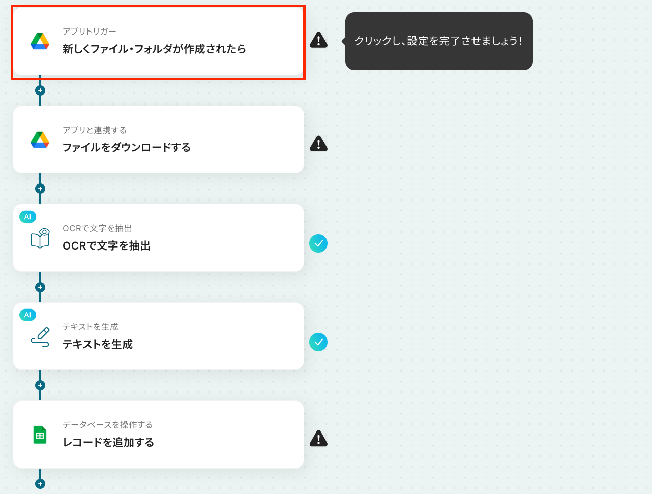 はじめに、Google DriveとGoogle スプレッドシートをYoomと連携します。 トリガーで、Google Driveを選択し、「新しくファイル・フォルダが作成されたら」アクションを設定し、領収書が格納されるフォルダを指定します。 オペレーションで、Google Driveの「ファイルをダウンロードする」アクションを設定し、トリガーで検知したファイルを取得します。 続いて、オペレーションでAI機能の「OCRで文字を抽出」アクションを設定し、ダウンロードしたファイルから必要な情報を抽出します。 続いて、オペレーションでAI機能の「テキストを生成」アクションを設定し、仕訳の内容を生成します。 最後に、Google スプレッドシートで領収書情報を追加するオペレーションを設定し、抽出した情報を指定のシートに記録します。 ※「トリガー」:フロー起動のきっかけとなるアクション、「オペレーション」:トリガー起動後、フロー内で処理を行うアクション