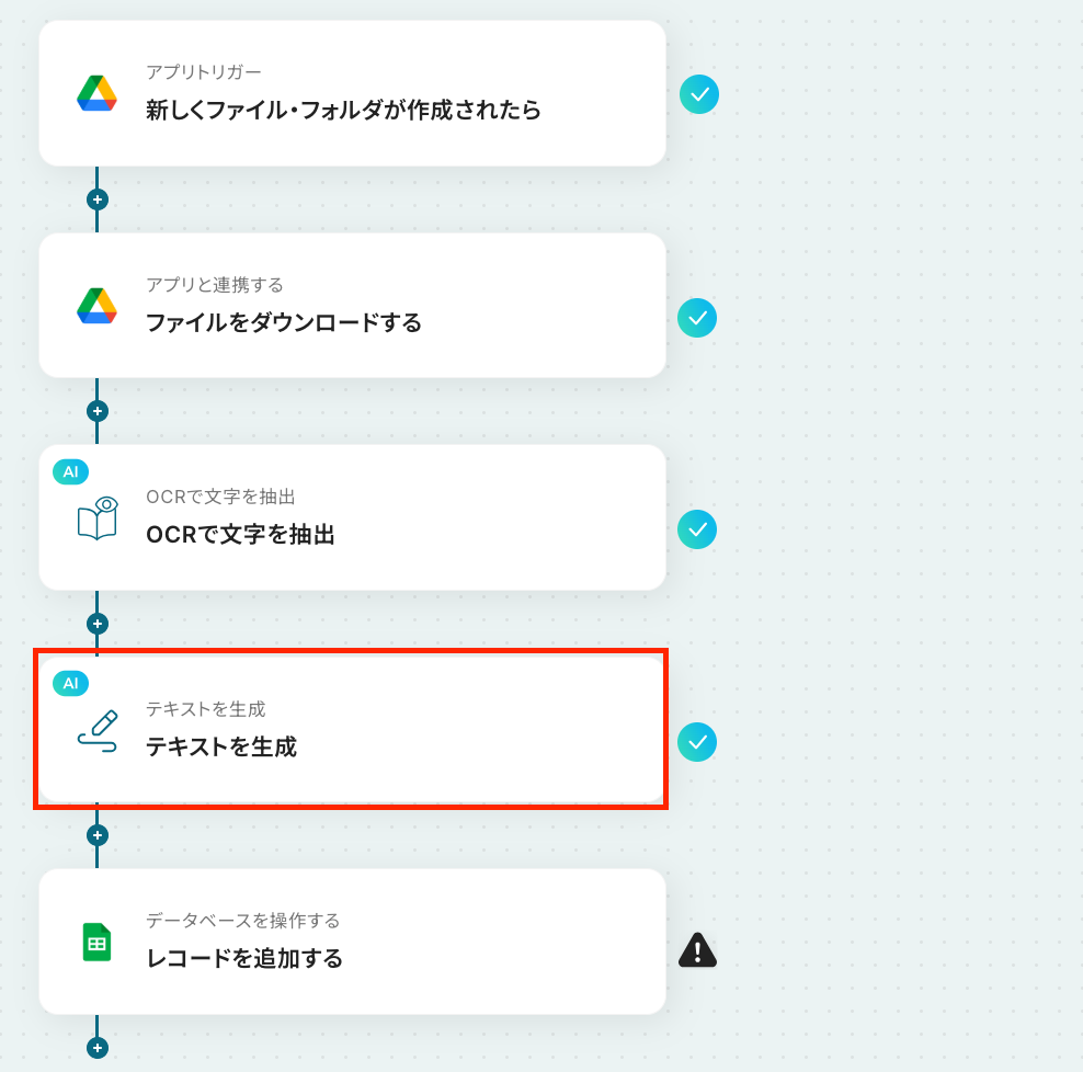 AI機能の「領収書を読み取る」アクションでは、店名や合計金額、日付など、読み取りたい項目を任意でカスタム設定できます。 AI機能の「テキストを生成」アクションでは、仕訳を行うなど、任意のプロンプトを設定できます。 Google スプレッドシートに追加する際、AI-OCR機能で読み取ったどの値をどの列に記録するかを、変数をマッピングして自由に設定できます。 ■注意事項