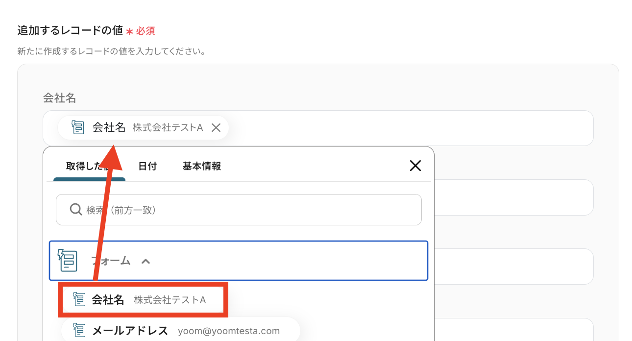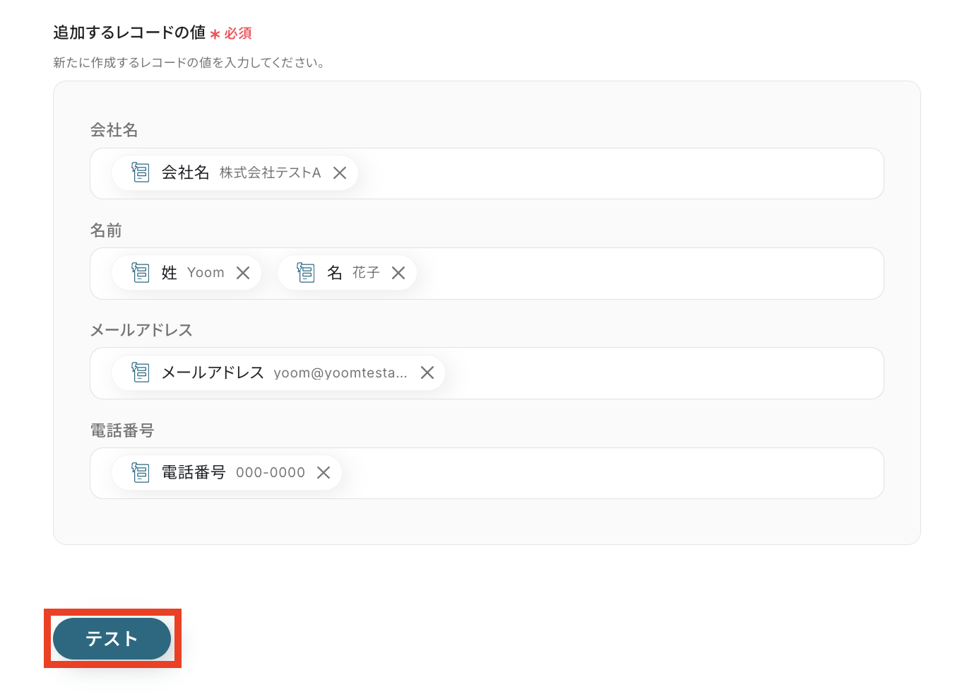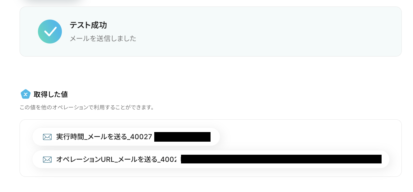 取得した値に入力したデータは、以降の設定でテストを行う際に各アプリに追加されます。