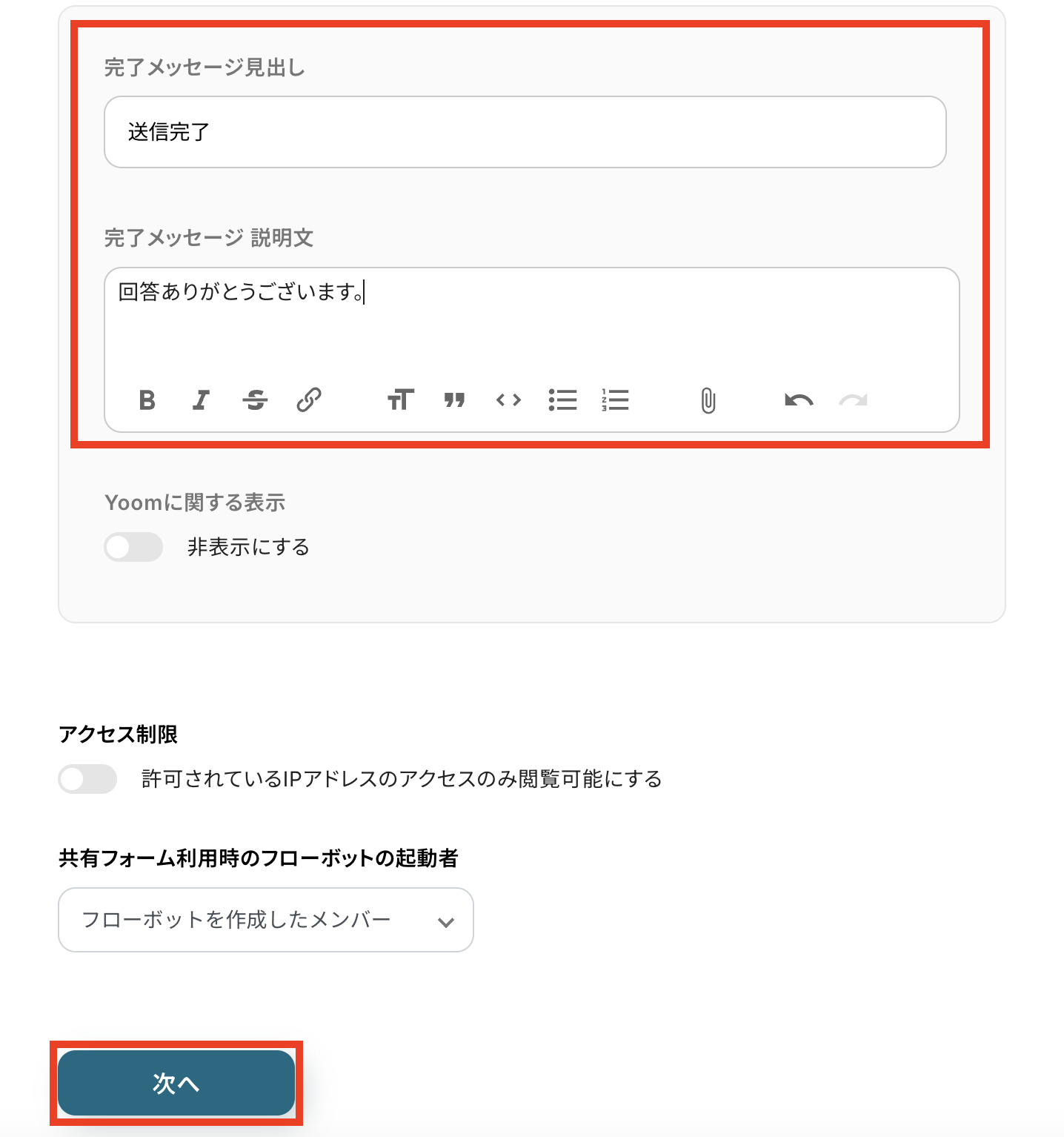 その他、アクセス制限や共有フォーム利用時のフローボットの起動者を任意で設定したら、「次へ」ボタンをクリックします。