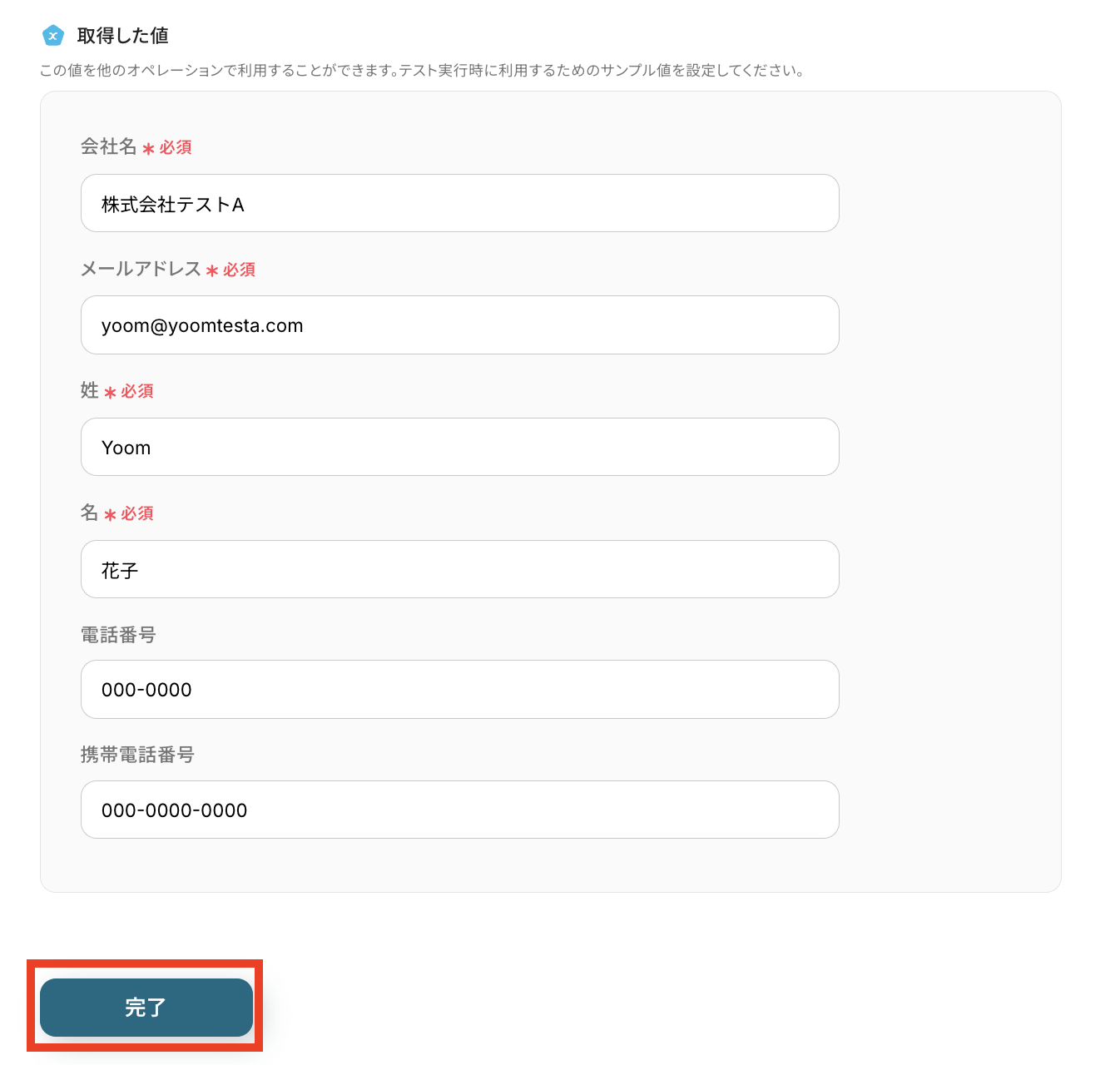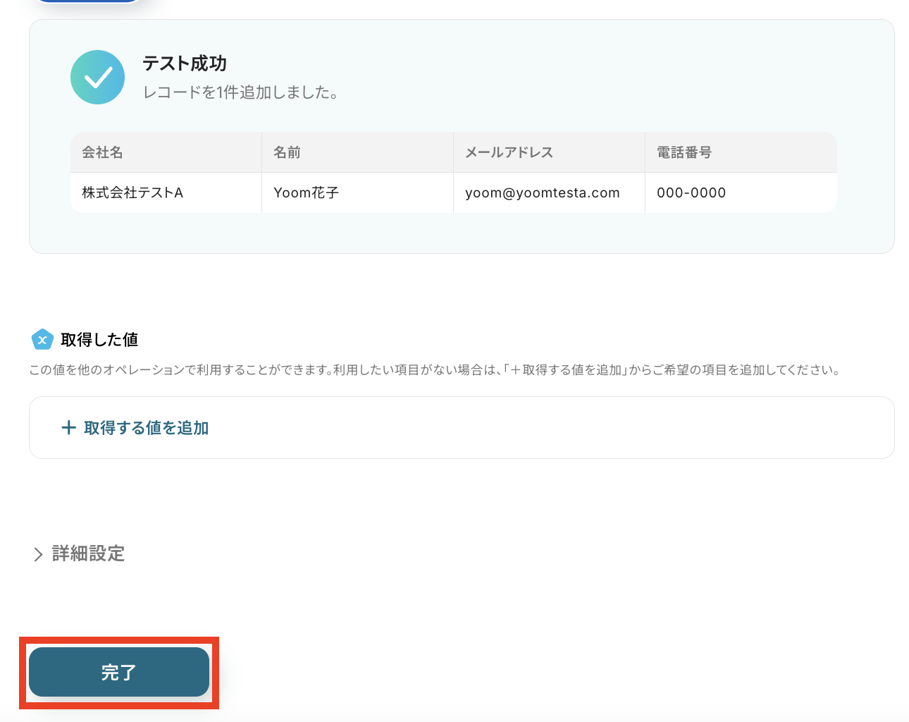 新規コンタクトが確認できたら、Yoomの設定に戻り、最後に完了ボタンを押しておきましょう!