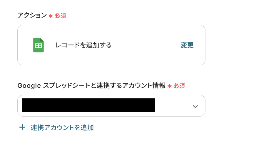 - 次に、オペレーションでGoogle スプレッドシートの「レコードを追加する」アクションを設定し、フォームの回答内容を記録します