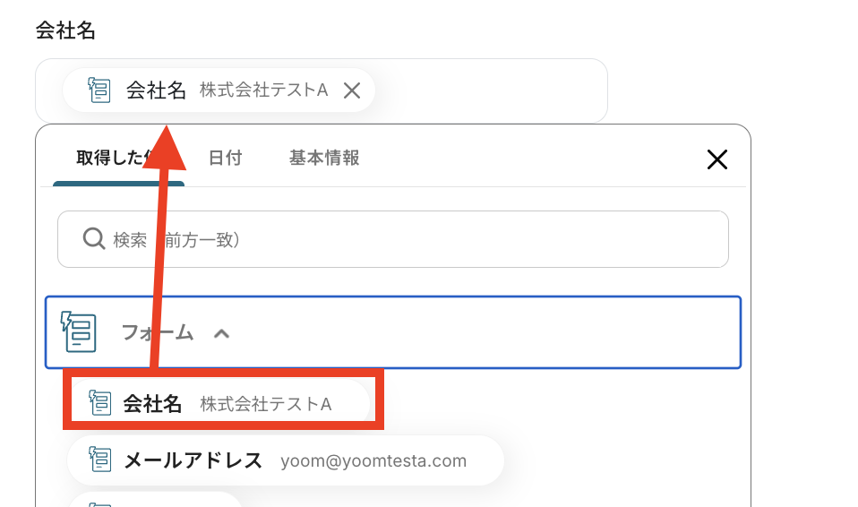 トリガーやオペレーション設定時に、「テスト」を実行して取得した値のことを指します。