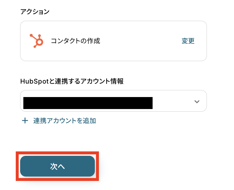 - 次に、オペレーションでHubSpotの「コンタクトの作成」アクションを設定し、新しいリードとして登録します