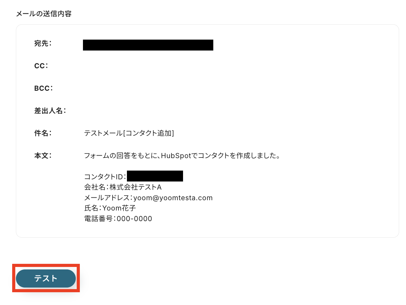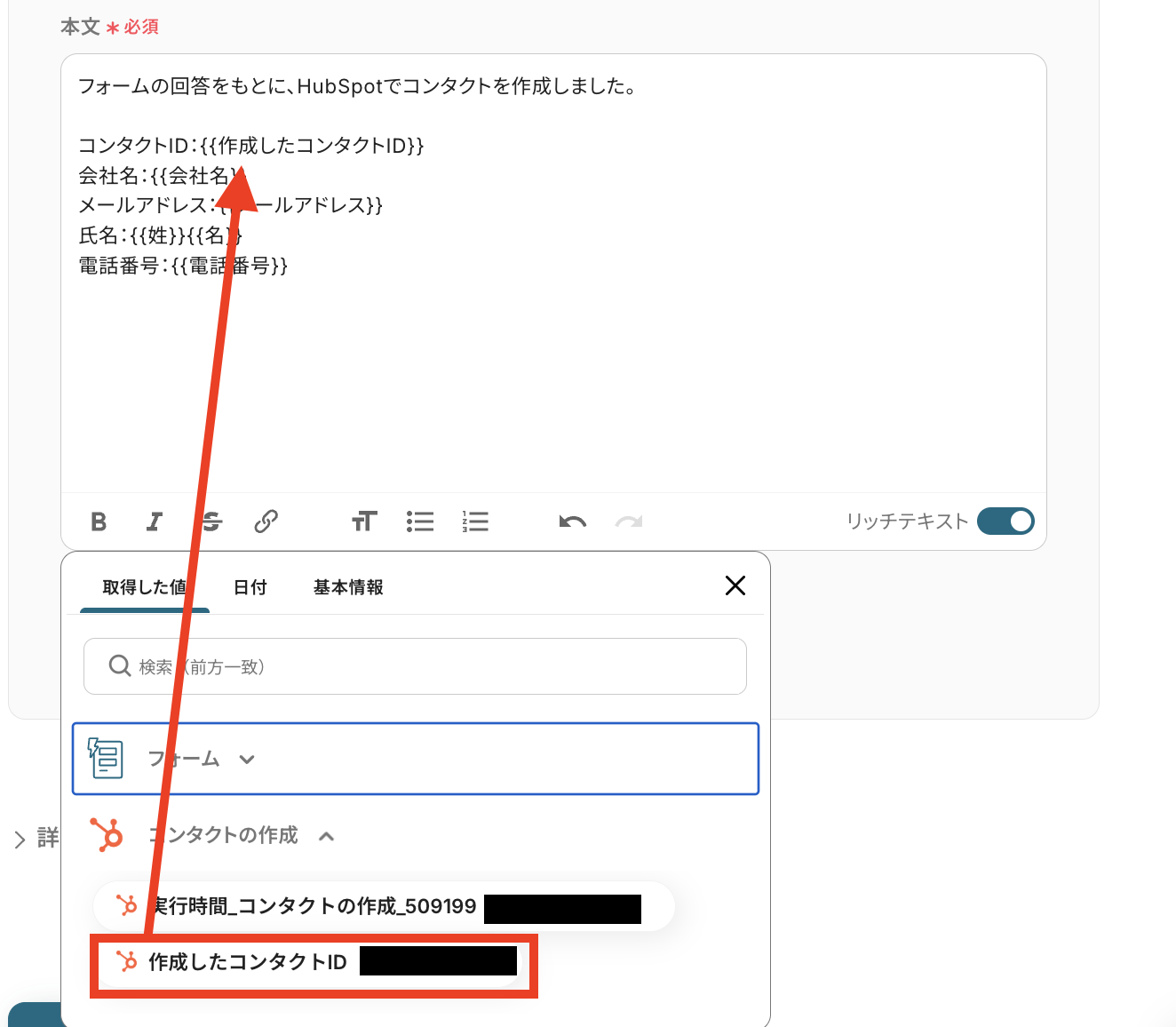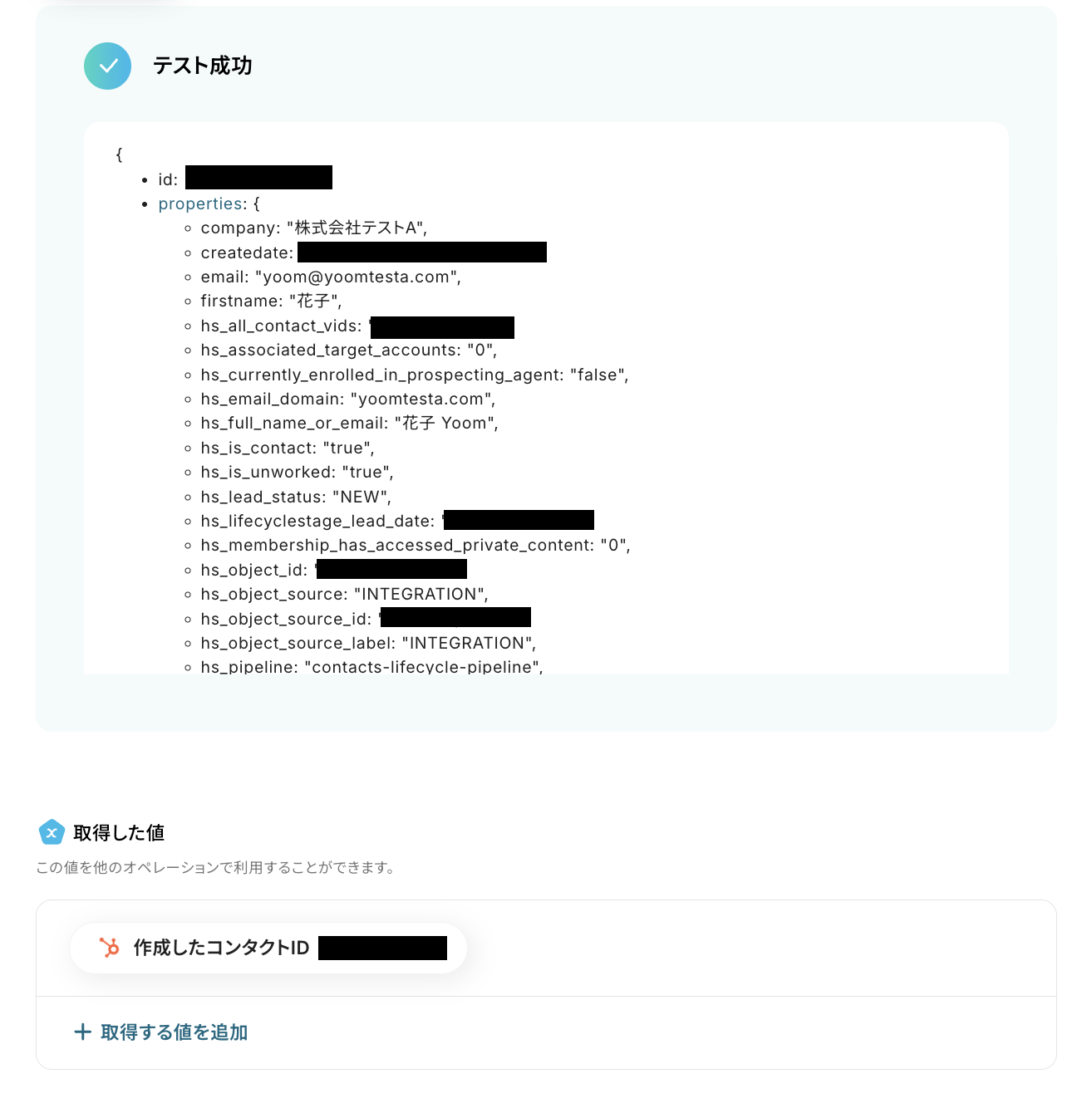 取得した値を利用して、HubSpotにコンタクトを作成する設定を行います。